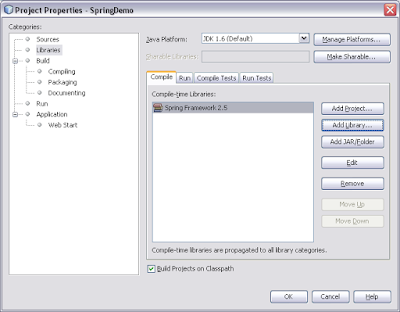 The output was as expected and the Netbeans has provided me support for writing the Spring Beans Configuration file. The support for visualization of these files is still not there. The dist folder now contains JAR for my project as well as a lib folder with the required JAR files which must be shipped with my JAR. The lib folder contains commons-logging and spring-2.5 JAR files.